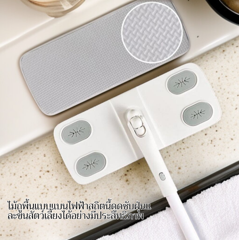 ● ไม้ถูพื้นแบบแบนกำจัดฝุ่นด้วยไฟฟ้าสถิต ช่วยดูดจับฝุ่นละอองและขนสัตว์ได้อย่างมีประสิทธิภาพ ไม่ฟุ้งกระจายขณะทำความสะอาด